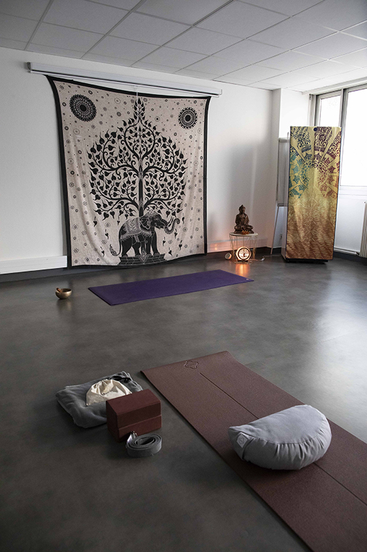 • d’une grande salle de pratique, destinée aux cours de yoga individuels et collectifs, aux séances de relaxation, de méditation, de bain sonore ainsi qu’aux formations organisées sur place.
